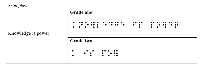 Alphabetic Braille is also known as Grade 1 Braille. In this type of Braille, each word and letter is written in the same way as it is in print. For example, the word “knowledge” is written using nine separate cells, one cell for each of the nine letters.