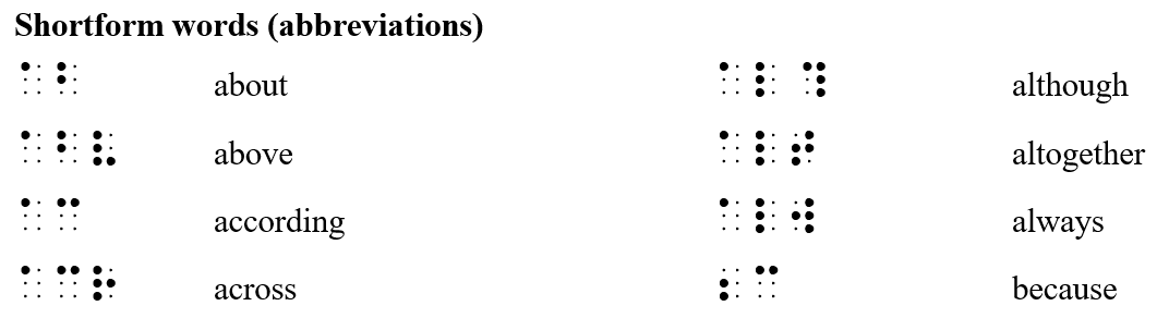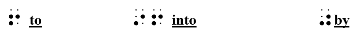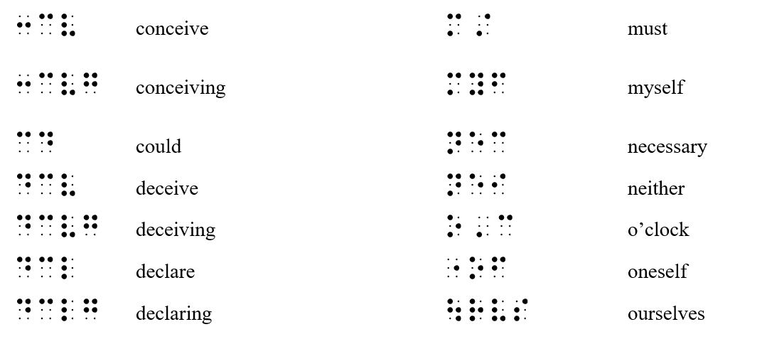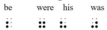 These four words, “be”, “were”, “his” and “was” are expressed by the above wordsigns, lower b, lower g, lower h, lower j, only where they are separated by a space from all other signs (except the capital indicator). Therefore, if the words adjoin lower punctuation in the print copy, they must be spelt out (for otherwise they would be regarded as punctuation themselves; e.g. a quote, etc.); and so, too, is the case where a letter is added to them, as: wasn’t, weren’t (BANA, 2002)
